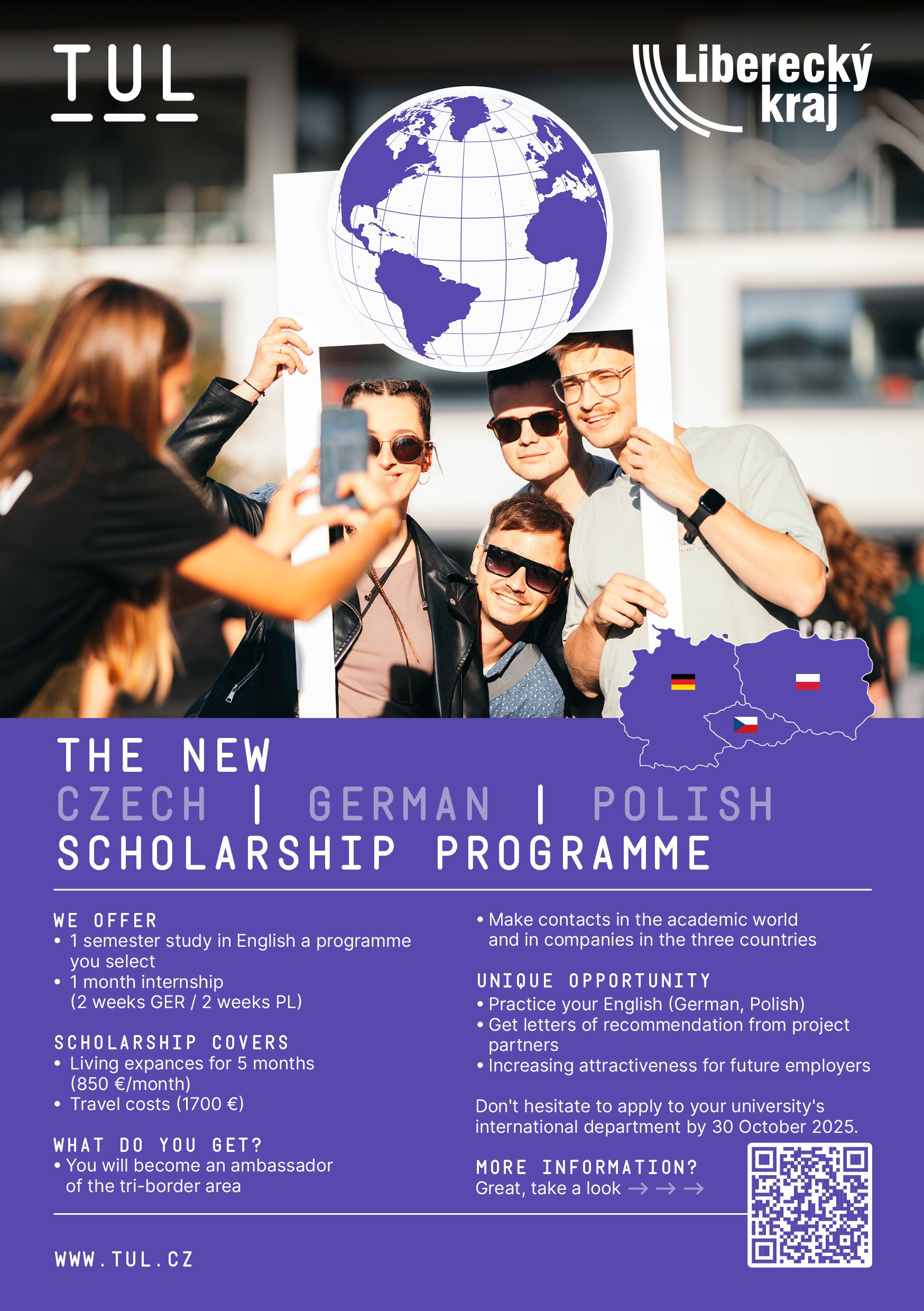 The Trilateral Scholarship Program is an international educational initiative aimed at promoting cooperation between the Czech Republic (TUL), Germany (Saxony), Poland (Lower Silesia), and global partners from Africa, Asia, and Latin America. The program is coordinated by the Liberec Region (KULK) and the Technical University of Liberec (TUL). Its goal is to explore global opportunities, identify collaboration potential in the field of innovation, and strengthen professional exchange in the trilateral border region.
